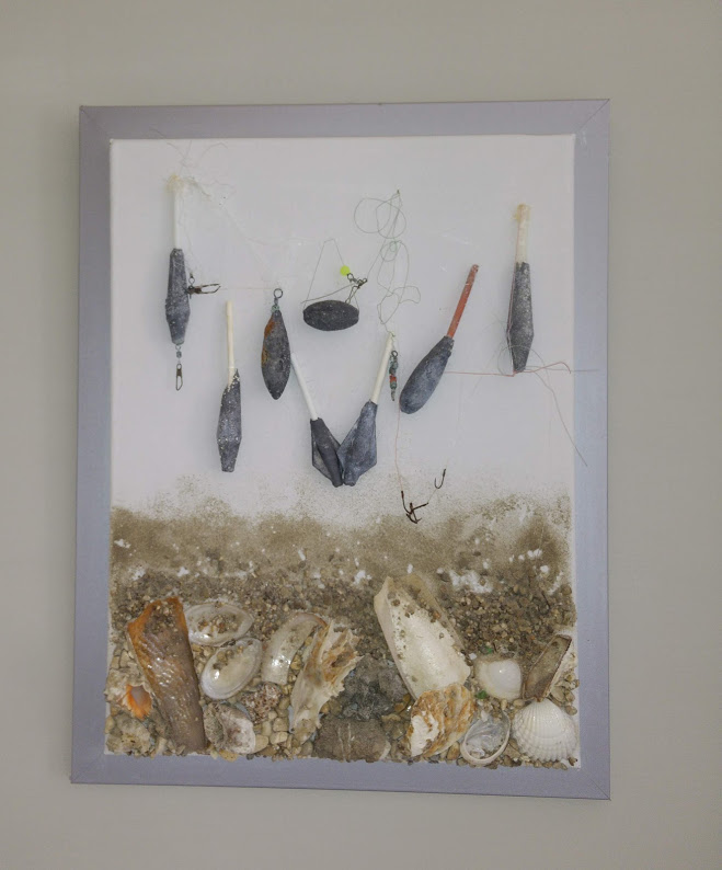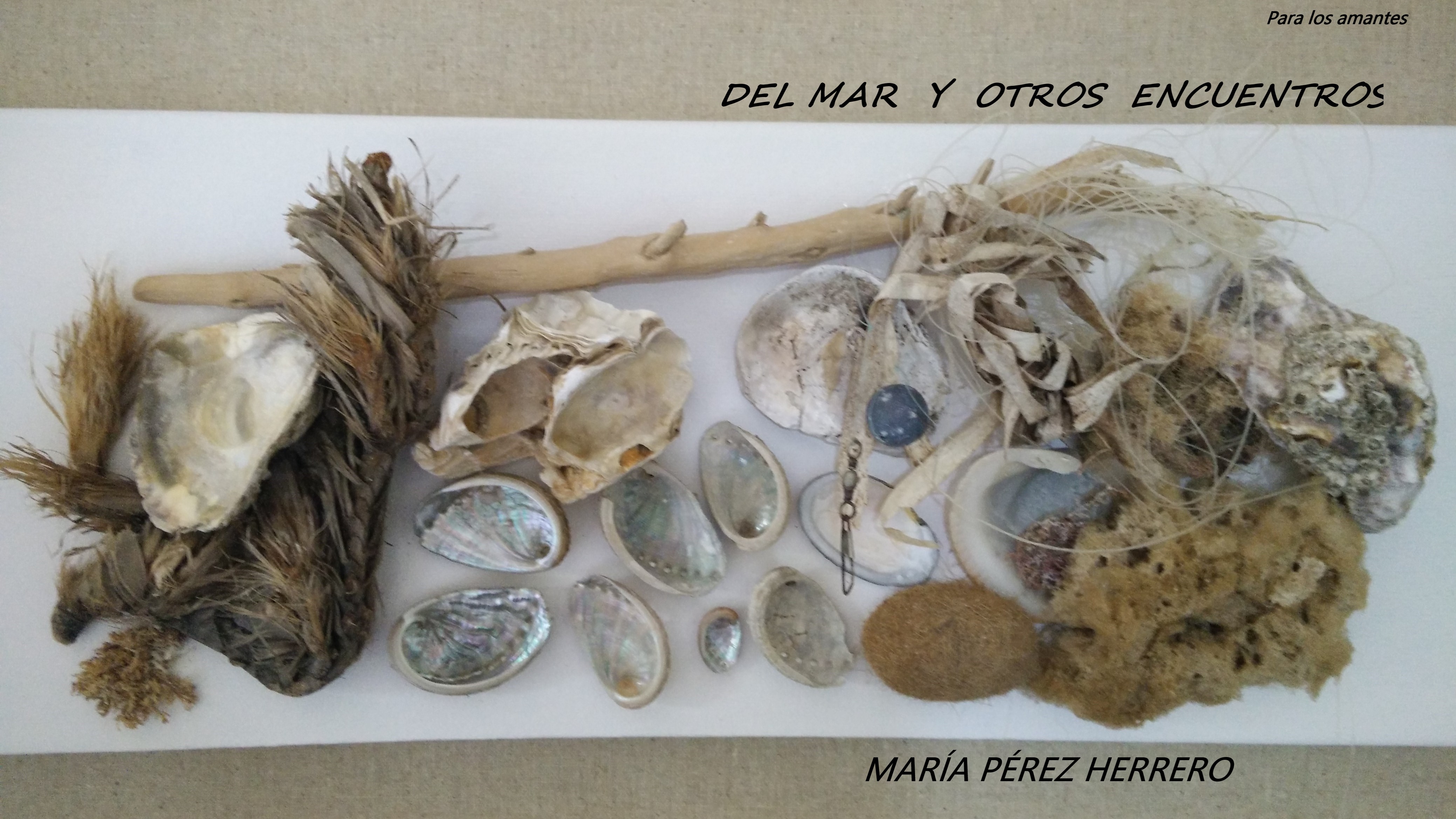 DEL MAR Y OTROS ENCUENTROS, un cuento en dos etapas; búsqueda del amor, como una ensoñación poética que se complementa con evocaciones marinas; collages que la propia autora crea con sus encuentros en el mar. Un sedal viejo, un plomo, algas, piedras… todo está ahí.. poesía…
